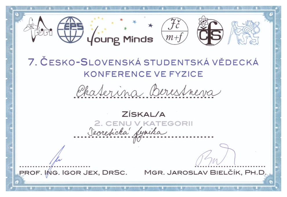 - 2017: M. Hrubovský a E. Berestneva - Dvě druhá místa na Česko-Slovenské studentské vědecké konferenciv kategoriích Teoretická fyzika a Biofyzika a fyzika molekulárních systémů + didaktika fyziky