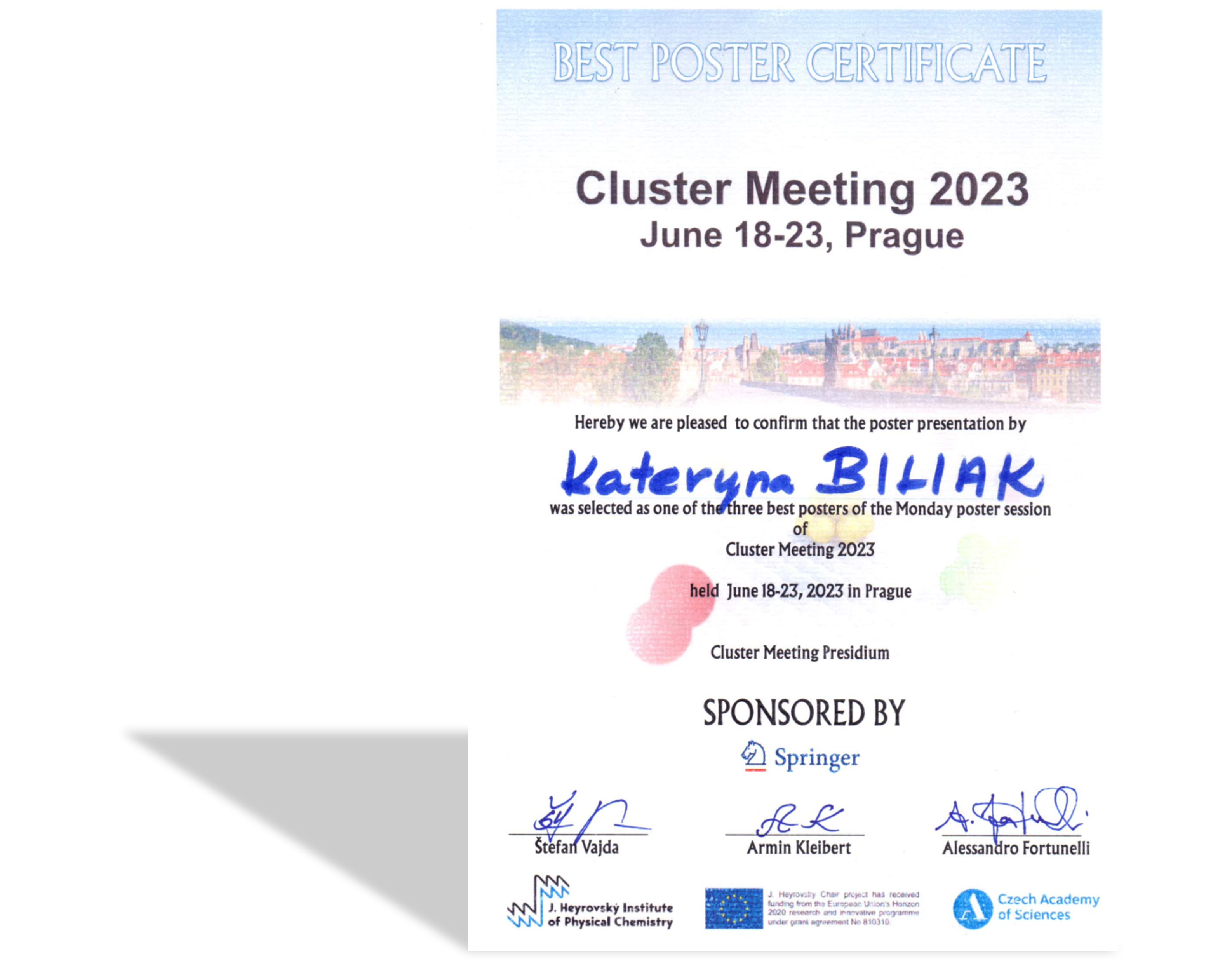 - 2023: K. Biliak - Best Poster Award - Cluster Meeting, Prague (Czech Republic)