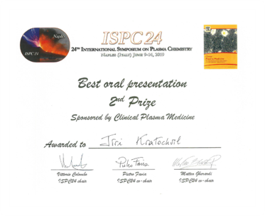 - 2019: J. Kratochvíl - Druhé místo v soutěži o Best Oral Presentation na konferenci International Symposium of Plasma Chemistry (Itálie)