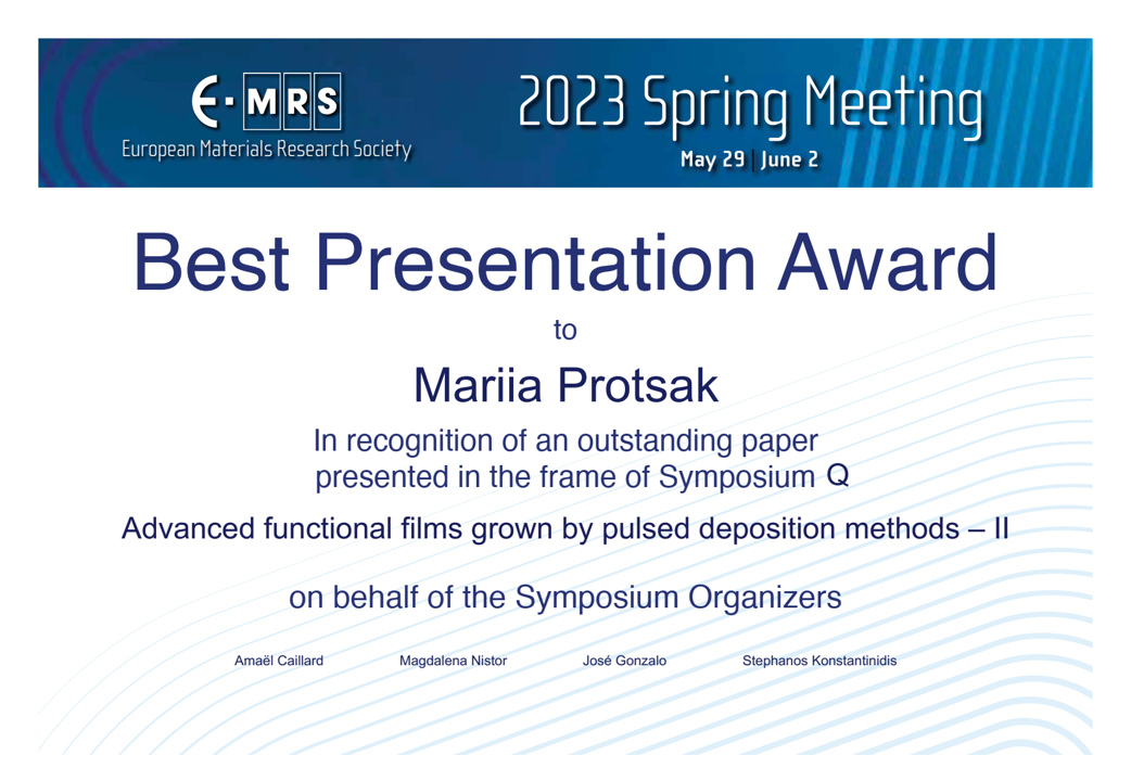 - 2023: M. Protsak - Best Presentation Award - EMRS Spring Meeting, Strasbourg (France)