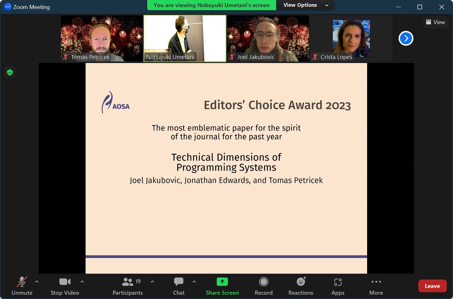 Each year, the <Programming> conference committee awards an Editor's Choice Award to the most "emblematic paper for the spirit of the journal". In 2023, the award was given to a paper Technical Dimensions of Programming Systems authored by Joel Jakubovic from University of Kent, Jonathan Edwards and Tomáš Petříček from Department of Distributed and Dependable Systems (D3S).